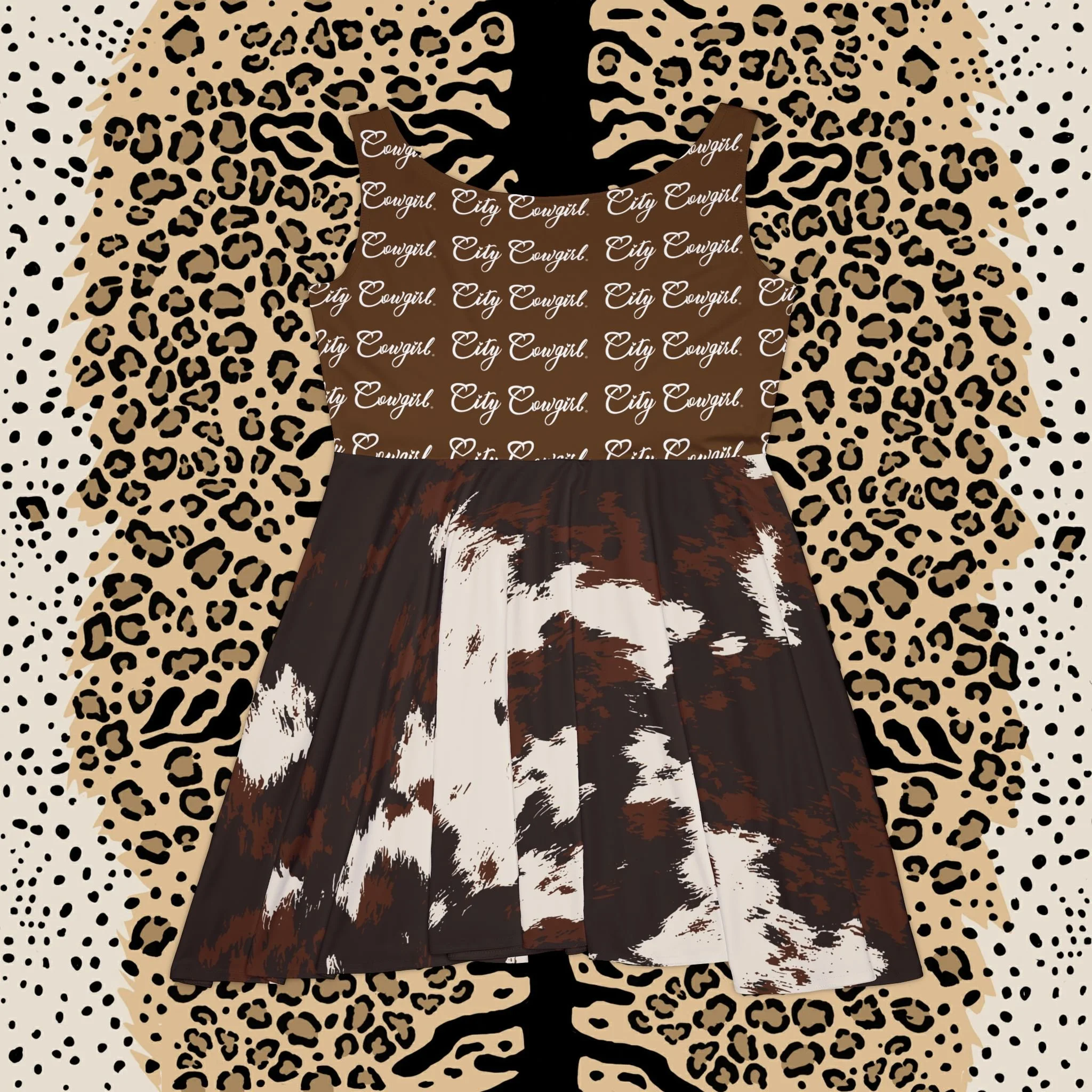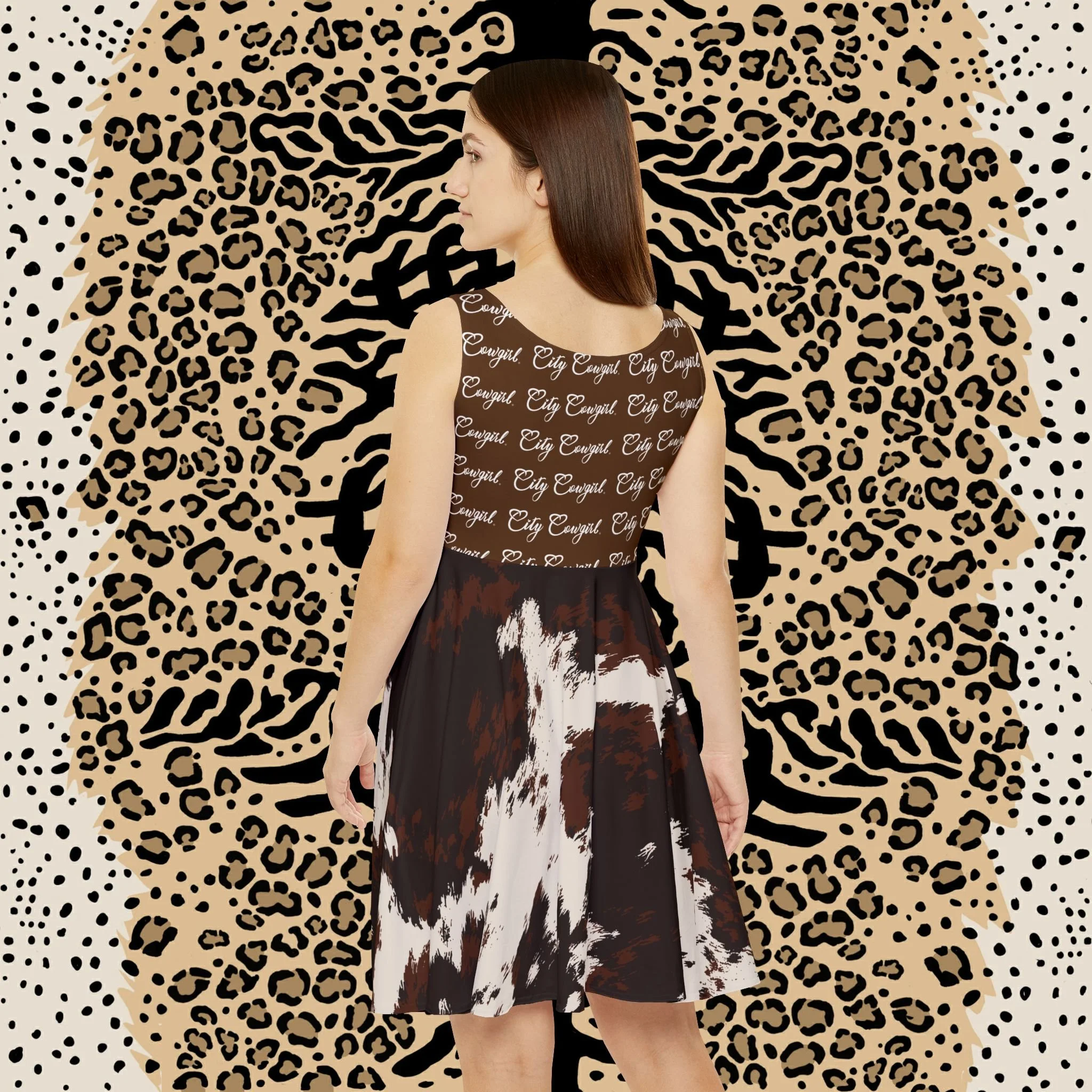 This mid-length skater dress brings together bold animal attitude and soft, stretchy comfort. The brown-and-cream cowhide print contrasts against a leopard-accented backdrop for an adventurous, ranch-meets-street look. A high scoop neckline and asymmetrical skirt add movement and playful shape as you walk. The fabric hugs and flows where it should — breathable polyester with spandex stretch that keeps the print vivid and the silhouette flattering. Wear it to markets, outdoor concerts, or casual nights out when you want a confident, slightly wild statement that still feels effortless.